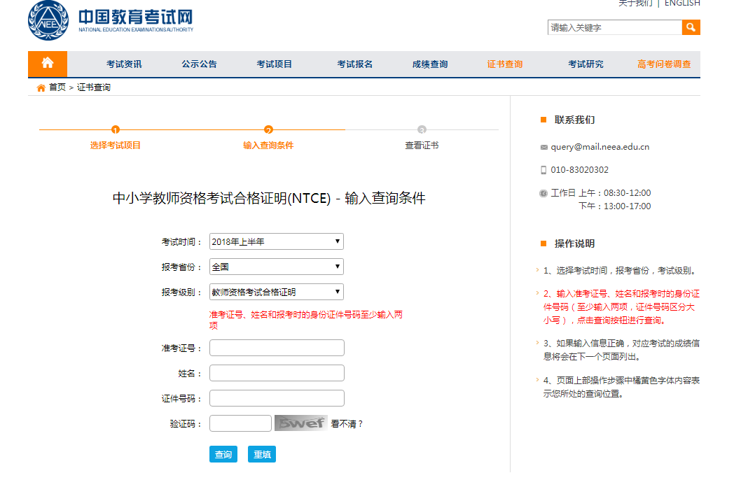2、进入“教育部考试中心证书查询系统”,考试时间选择“2018年下半年”,输入姓名、身份证号、验证码(准考证号可不输入)