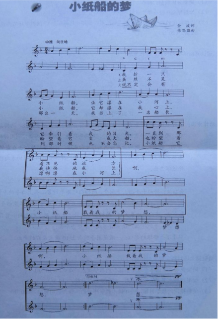 (1)本首歌是一首好听的儿童歌曲,歌曲分为两个部分合唱部分为副歌部分,合唱前面的为主歌部分,主歌由四个乐句组成每一个乐句都有四个小节。前三乐句上行,第四乐句如同波浪。前两小节,如同小纸船随着小河起伏,若隐若现(弱起:那、的);后两小节,如同小纸船渐渐向远方逝去。通过这节课的学习,营造恬静的意境,从而让学生得到美的熏陶。
