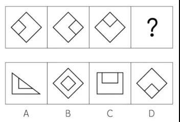 解析:前面三个图形都是同一个图形旋转后的图形,只有D选项符合。