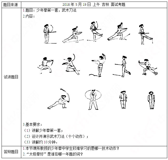 以上是关于“小学体育教师资格面试真题及解析:少年拳第一套武术刀法”的全部内容,考生如果想获得更多关于江苏教师资格证相关资讯,如江苏教师资格证笔试试题、报考指南、成绩查询、面试时间以及相关知识,敬请关注我们江苏教师资格证网。