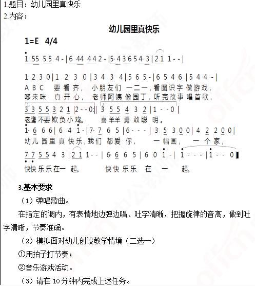 以上是关于“幼儿教师资格面试试讲真题及解析弹唱《幼儿园里真快乐》”的全部内容,考生如果想获得更多关于江苏教师资格证相关资讯,如江苏教师资格证笔试试题、报考指南、成绩查询、面试时间以及相关知识,敬请关注我们江苏教师资格证网。