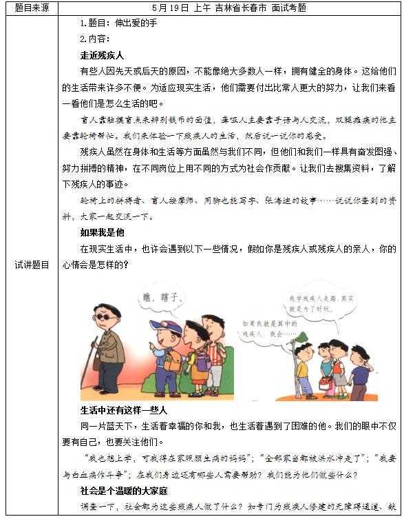 教师根据学生的回答进行归纳,在面对这些残疾人时,我们应该平等对待他们,理解尊重他们,在学习和生活上帮助他们,让他们感受到社会对他们的关爱。