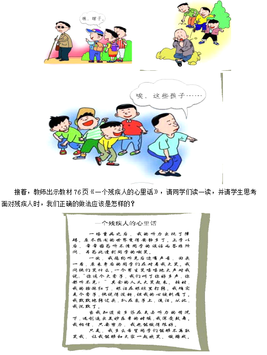 教师通过课件展示教材76页图片,请同学们分小组,选出组员做图中的残疾人,其他组员做残疾人的家人,请同学们根据图画内容扮演角色。学生表演之后,请扮演残疾人的同学说一说他们被嘲笑、被欺负时的心情;请扮演残疾人家人的同学说一说他们的感受。