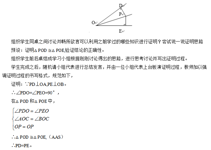 ③重视知识发生过程的教学,对概念,应使学生参与其形成过程,即怎样从实例抽象概括出来,例如,体的概念是怎样从实物中抽象出来的;对图形的性质,应引导学生积极观察、实验、思考、探究和交流,通过教学活动,自己得出结论,例如,本题的角平分线的性质的教学过程设计。