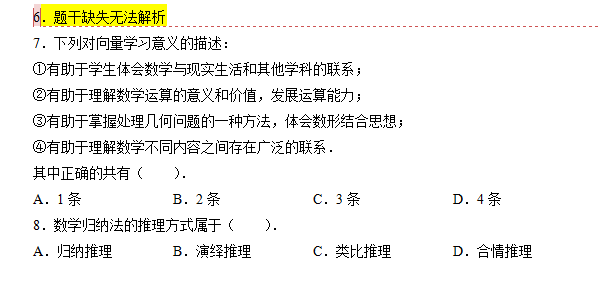 7.答案:D.4条.解析:向量理论具有神格的数学内涵,丰富的物理背景,向量既是代数研究对象也是几何研究对象,是沟通几何与代数的桥梁。向量是描述直线、曲线、平面、以及高维空间数学问题的基本工具,是进一步学习和研究其他数学领域问题的基础,在解决实际问题中发挥重要作用。本单元的学习可以帮助学生理解平面向量的几何意义和代数意义,掌握平面向量的概念、运算、向量基本定理以及向量的应用,用向量语言、方法和解决现实生活、数学和物理的问题,故本题选:D。