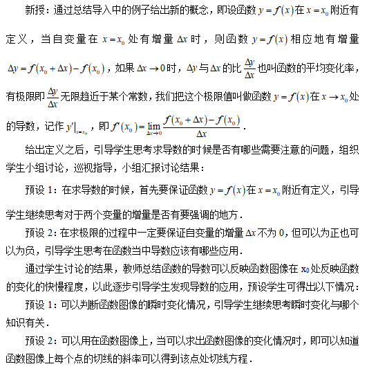 (2)导入:通过复习瞬时速度、切线的斜率的求法引导学生从函数的角度思考函数的增量与自变量增量之间比的极限,从而引出导数的本节标题.