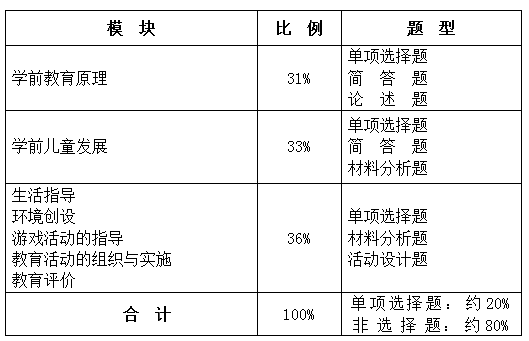 考试内容主要涵盖学前儿童发展、学前教育原理、生活指导、环境创设、游戏活动的指导、教育活动的组织与实施、教育评价等七个模块。能力要求分为了解、理解、熟悉、掌握、运用五个层次。