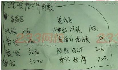 15、材料:角色游戏中,大二班在教室里开展理发店主题游戏。教师为了提升幼儿的游戏水平,主动为幼儿制作了理发店价目表(见图1)